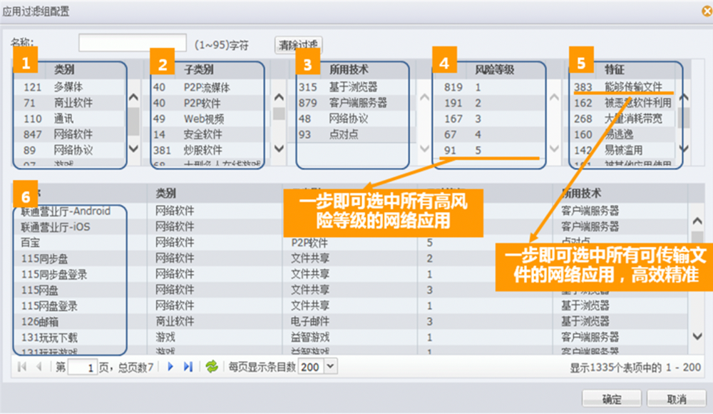●精准应用筛选。Ezpay数码下一代防火墙给予了精细化的应用筛选机制。用户可根据应用名称、应用类别、应用子类别、风险级别、所用技术、应用特征等6大条件。精确筛选出感兴趣的应用类型,如具备文件传输功能的通讯软件,或存在已知漏洞、基于浏览器的WEB视频应用等等,从而实现精细化的应用管控。